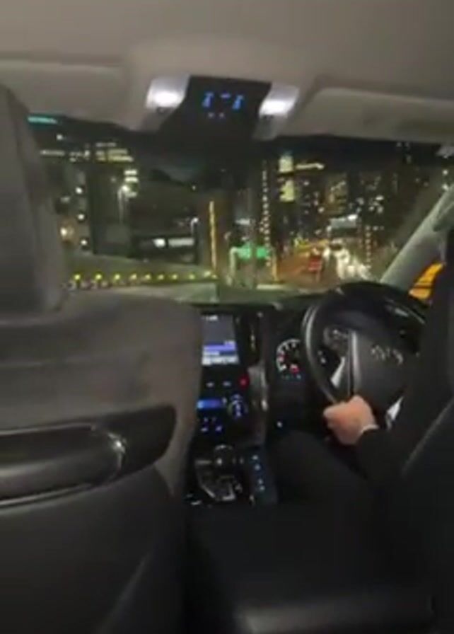 A car drives along a highway at night. The driver sits in the front of the car, wearing a black jacket. From inside the car, high-rise buildings illuminate the cityscape on both sides of the road. The dashboard is visible, including the steering wheel and a navigation screen. A green sign is visible that indicates the direction of travel.