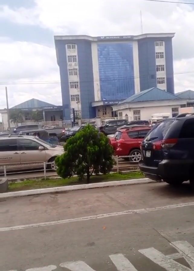 The camera captures a view of the Delta State Revenue House, a tall building with a blue glass center and white window frames. The building is labeled "REVENUE OUSE" at the top. In front of the building is a parking lot filled with various cars, including a red SUV, a tan minivan, and a dark SUV. A small, conical shrub sits in a strip of grass separating the parking lot from the road. On the road, partially visible, is the painted word "PARK" and the remainder is cropped. Other buildings can be seen in the background to the left, including one labeled "CONFERENCE HALL". The sky above is cloudy. The overall scene suggests a government or administrative complex during a busy time of day.