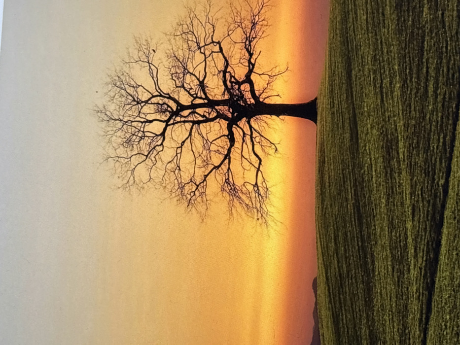 An image presents a stark, leafless tree silhouetted against an orange sky, likely during sunrise or sunset
