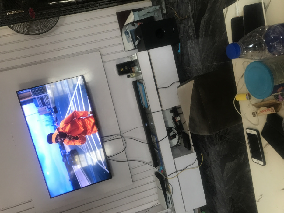The image depicts an indoor living space in Akure, Nigeria. A large, wall-mounted flat-screen television prominently displays a male figure wearing an orange hooded tracksuit and dark headwear on what appears to be an elevated urban roadway; he gestures with his right index finger to his mouth. Below the television, a white entertainment console holds a soundbar, a video game console, and various electronic devices with visible cables. On the right side of the console, a '5G' labeled object, small bottles, and a blue tablet are visible. The room has white walls, some with vertical stripes, and a dark, glossy, marbled tile floor. A black stand fan is partially visible on the far right. A framed image of a person's legs leans on the floor. In the foreground, a white table features two smartphones, a plastic water bottle with a blue cap, a yellow lighter, and other small objects. A dark and light-toned ottoman sits in the mid-ground.
