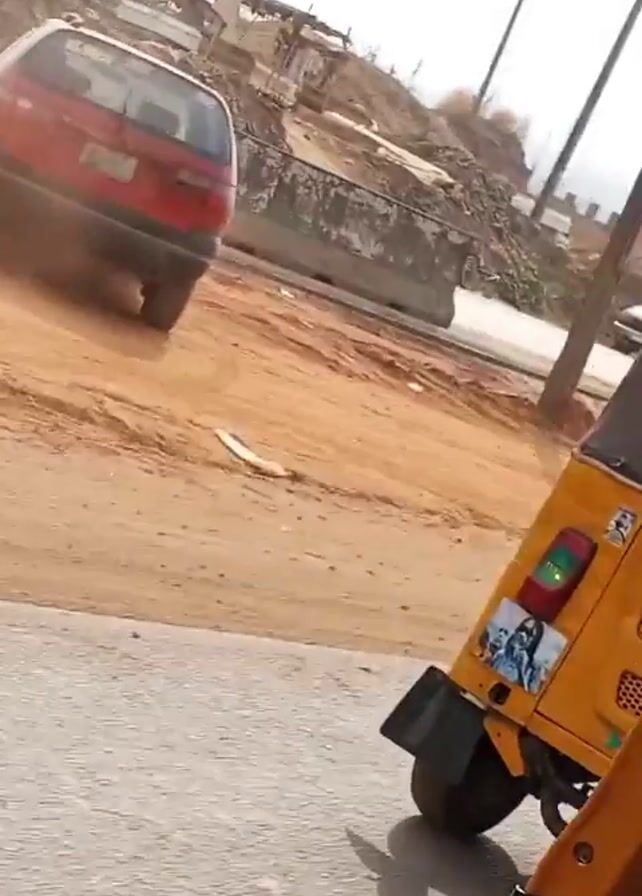 The camera is inside a yellow three-wheeled vehicle, possibly a tuk-tuk or auto-rickshaw, driving along a paved road. Outside the vehicle, the landscape features a substantial amount of red-orange dirt or soil. Concrete barriers and building debris are scattered along the roadside. Other vehicles, including a maroon minivan and a white sedan, are visible driving in the opposite direction. The weather appears overcast and bright. The vehicle is moving forward, and the view shifts slightly as it progresses along the road.