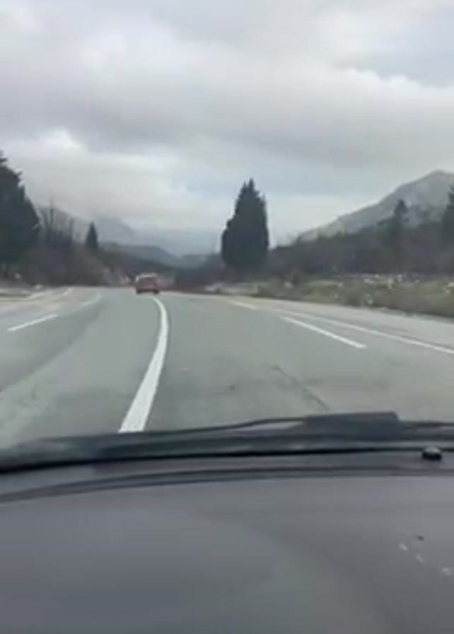 A car drives on a gray paved highway with white lines indicating lanes. Another car travels ahead in the same direction. The landscape surrounding the road includes trees, vegetation, and a mountain range visible in the distance under a cloudy sky. The video is shot from the perspective of the driver inside a car. High-pitched music is playing.
