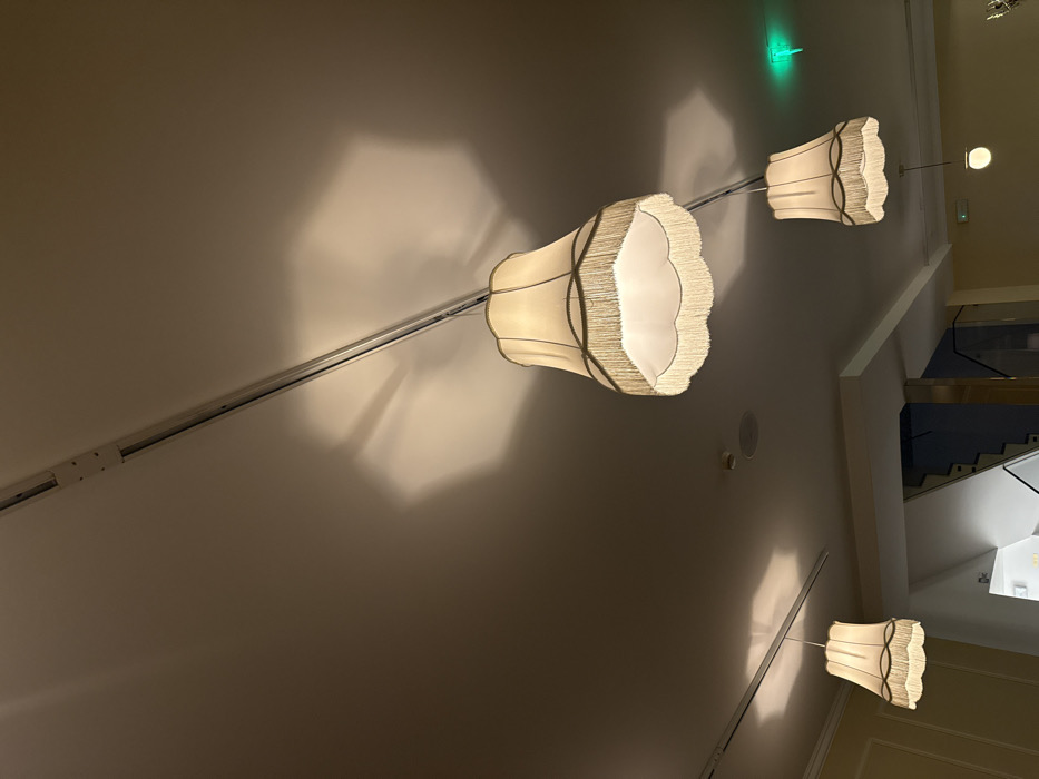 Three lamps with ruffled shades hang from a metal track on a cream-colored ceiling. The lamps cast large, diffuse shadows. A green emergency light is visible near the first lamp. In the background, a staircase is partially visible through an opening. The overall lighting is warm.