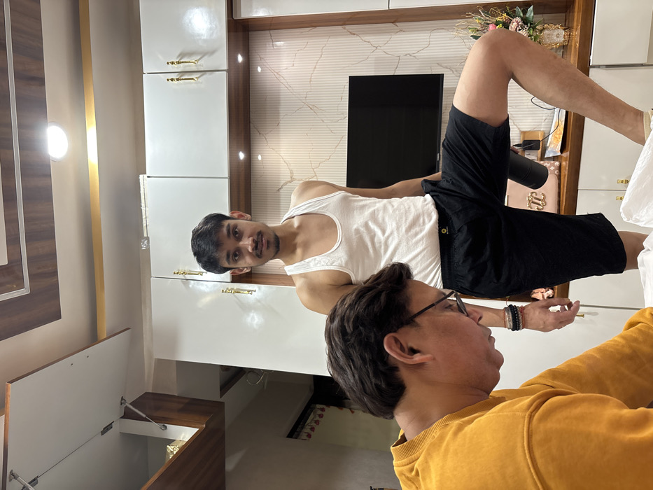 Two men pose indoors. One wears a white tank top and black shorts, looking directly at the camera. The other man wears an orange sweater and glasses, appearing in the foreground, partially obscured. Behind them is a modern interior with white cabinets featuring gold handles, a marble-patterned wall, and a black television. Other decor elements include a floral arrangement and a designer handbag. The room has warm lighting.