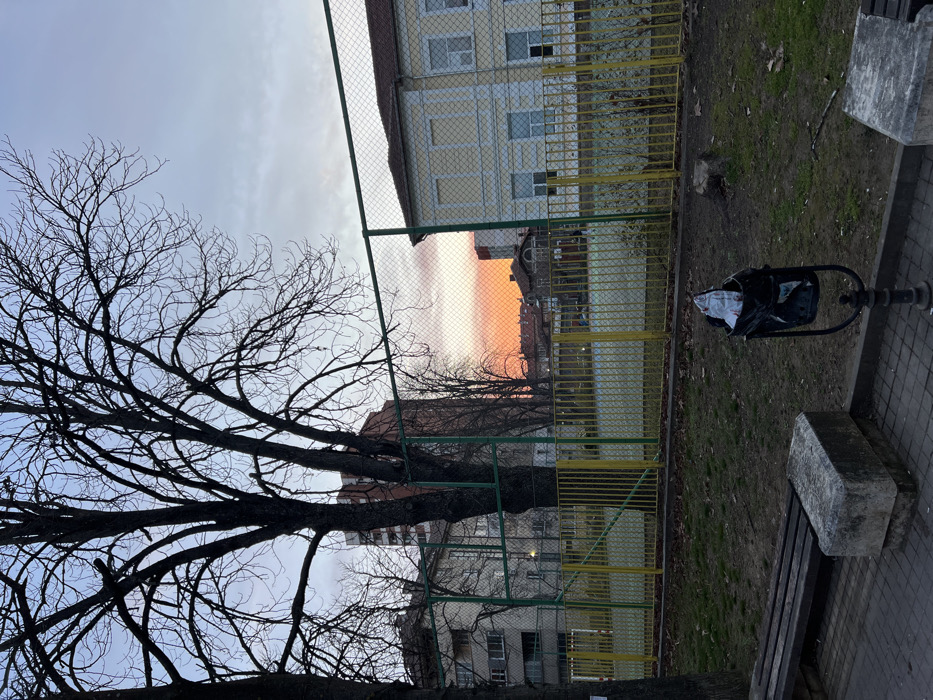 The scene depicts an urban landscape in Lovech, Bulgaria, at dusk. The sky transitions from a vibrant orange-red hue near the horizon to a lighter blue and grey overhead, with clouds present. In the foreground, a paved sidewalk with square pavers runs horizontally, featuring a dark wooden bench with concrete supports on the left and a black metal waste bin on a post on the right. The waste bin contains an overflowing white plastic bag with refuse. The ground adjacent to the sidewalk is a mix of sparse grass and bare earth, with some fallen brown leaves. A prominent, large deciduous tree with bare branches dominates the left half of the image, extending from the bottom left corner upwards and across the frame. Behind the foreground elements and the tree, a green-framed chain-link fence with yellow vertical bars at its base encloses what appears to be a playing field or court. The surface of this field is light-colored, possibly artificial turf or concrete, showing some wear. In the mid-background, behind the fence, various buildings are visible. To the far right, a two-story beige building with a brown tiled roof and multiple rectangular windows is present. Towards the left and center, behind the playing field, several multi-story residential buildings with balconies are visible, including a taller, reddish-brown apartment building discernible through the bare branches of the large foreground tree. No individuals or specific actions are observed within the frame.