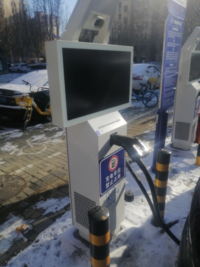 An electric vehicle charging station stands in a snowy environment. The station features a large, blank screen, a charging port, and a sign with Chinese characters. Black and yellow striped bollards protect the station. In the background, a car and bicycles are partially covered in snow, and buildings are visible in the distance. The ground is a mix of snow and brick paving.