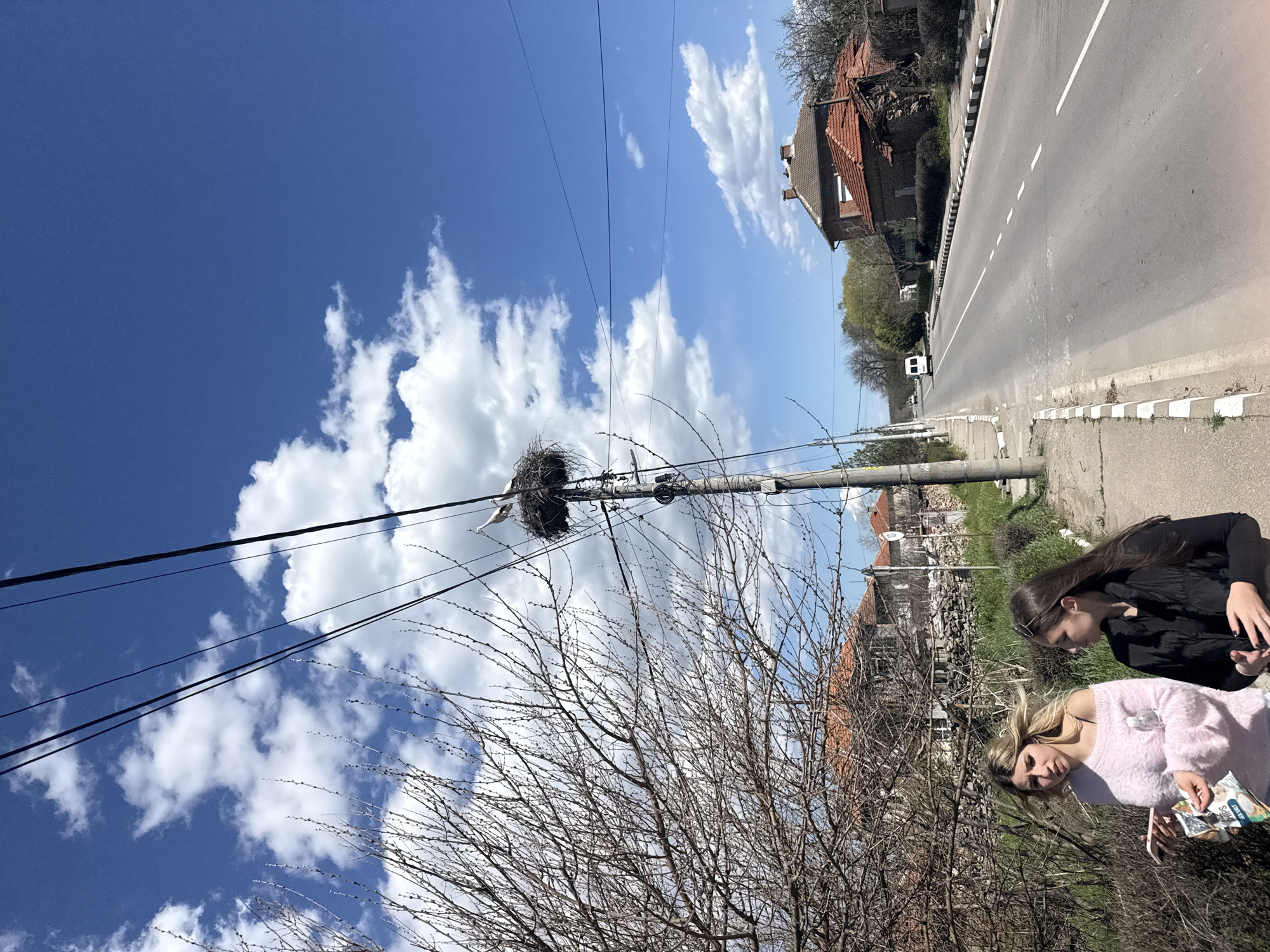 daytime outdoor scene in Dobrich, Bulgaria. A utility pole supports a large bird's nest near the top, with power lines extending from it against a blue sky with scattered white clouds. A bare tree occupies the foreground, partially obscuring the view. To the right, a road runs alongside a sidewalk, with buildings visible in the background. Two females are standing on the sidewalk, one wearing a pink sweater and the other in a black top. They are both looking down.