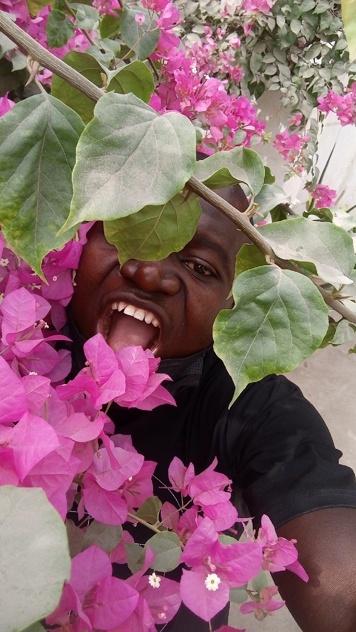 An individual with dark skin is depicted partially obscured by vibrant pink bougainvillea foliage in Dakata, Nigeria