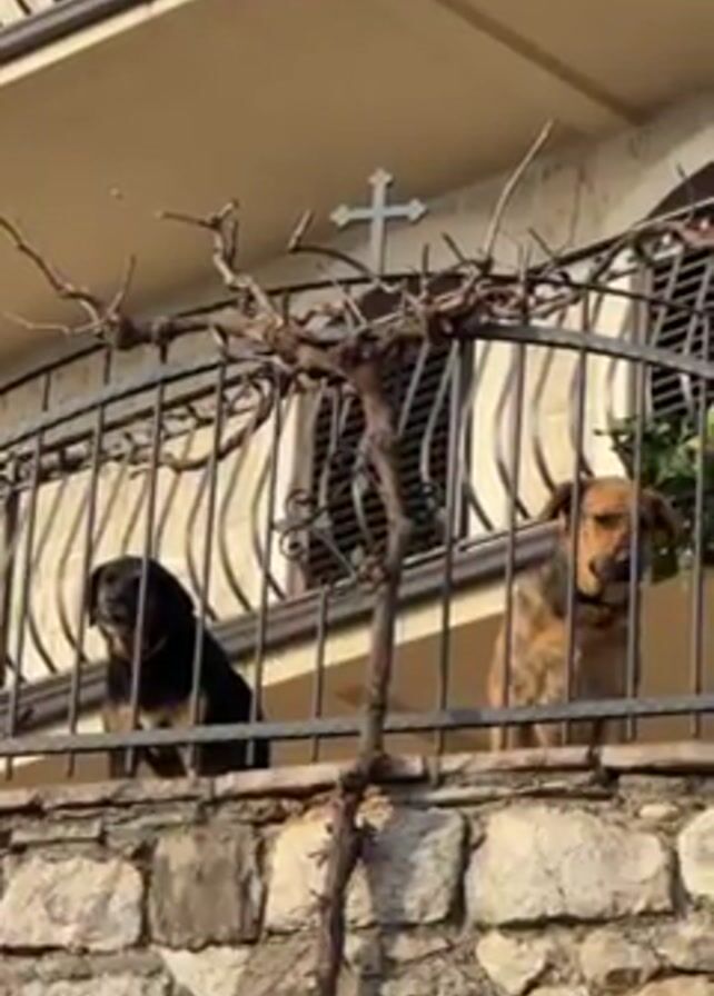 Two dogs stand on a balcony behind a black iron railing. One dog is mostly black. The other dog is tan and brown. Both dogs look out at something beyond the camera’s view. The black dog barks twice. Above the balcony is a white building with a Christian cross. There is a vine winding around the railing. The balcony is built on top of a stone wall.