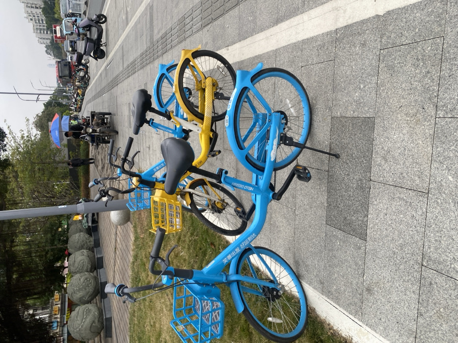 Two bicycles are parked on a paved surface, alongside a road with vehicles. One bicycle is predominantly blue with a yellow basket, while the other has a yellow frame with blue accents. Both appear to be rental bikes. A row of decorative stone spheres lines the edge of a green space, with trees visible in the background. Further back, a busy road is filled with cars, buses, and motorbikes.