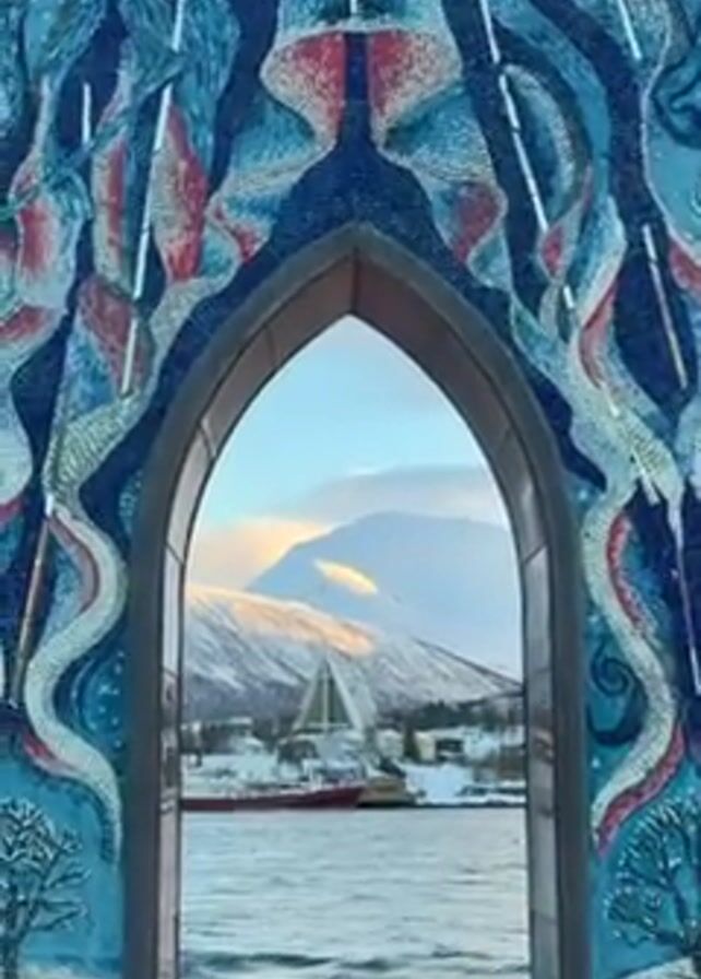 stone archway with a mosaic on its surface, framing a picturesque landscape of a harbor, snow-covered mountains, and a city in the background. The mosaic features an abstract design with blue, red, and white tiles resembling waves or stylized northern lights, with small trees at the base. The archway is topped with a pattern of red and brown leaf-like shapes. There is snow on the ground around the arch. Through the arch, the water is visible along with ships, buildings, and a prominent mountain range bathed in the soft light of the day. Voices can be heard in the background.
