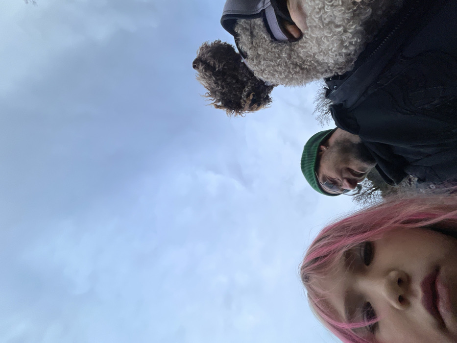 The image depicts a low-angle view looking up at three individuals and a dog. A person with pink hair is positioned at the bottom of the frame. Above them, a person with a green beanie and glasses is visible. Further up, a person with a light grey jacket stands beside a fluffy brown dog. The background shows a cloudy sky.