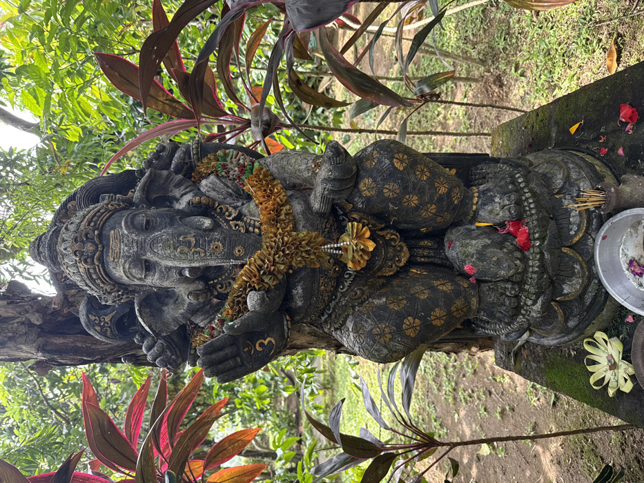 A stone statue of Ganesha, the Hindu elephant-headed god, sits amidst lush greenery
