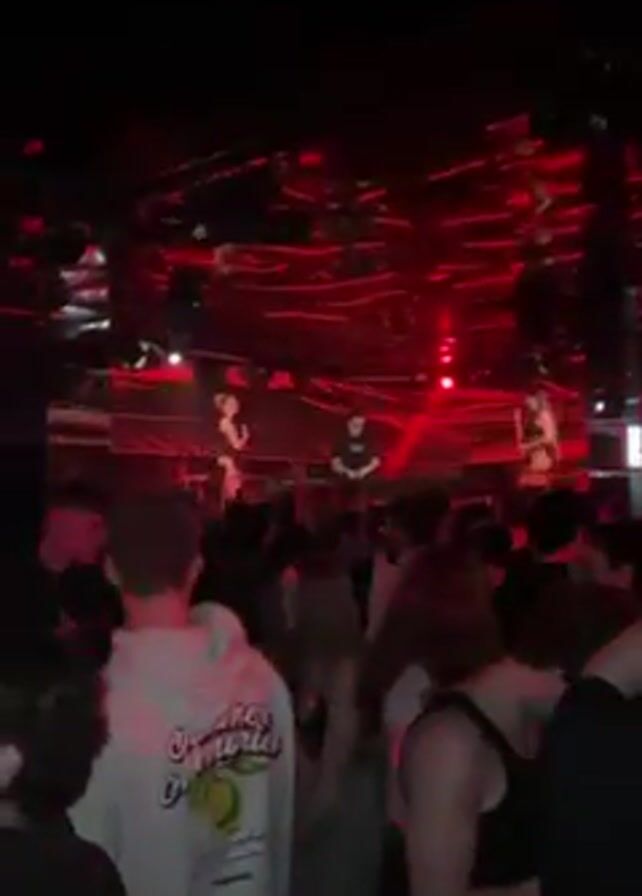 crowded club scene with a stage bathed in red light. Several performers are visible on the stage, including a woman wearing a revealing outfit. The crowd is a mix of young men and women, some dressed casually in hoodies and tank tops. The room is dark, with lighting focused on the stage and ceiling, which features a modern, geometric design. People are close together, suggesting a high-energy and lively atmosphere.