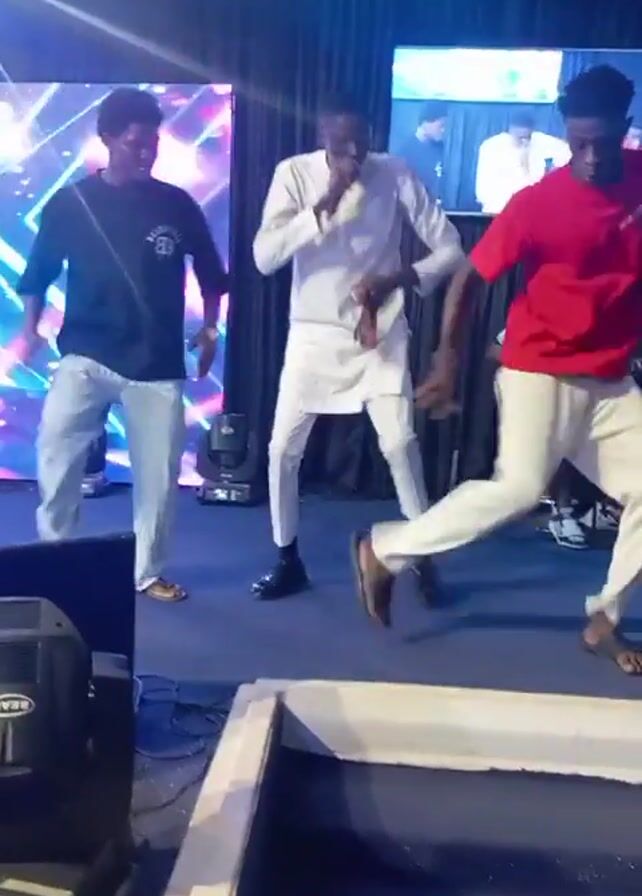 Three young men perform on stage. One man wears white and sings into a microphone. The other two men dance; one in a red shirt and the other in black. They wear off-white pants. In the background, there is a monitor showing the performers, and stage lighting overhead. An equipment box is near the base of the stage. The stage is carpeted.