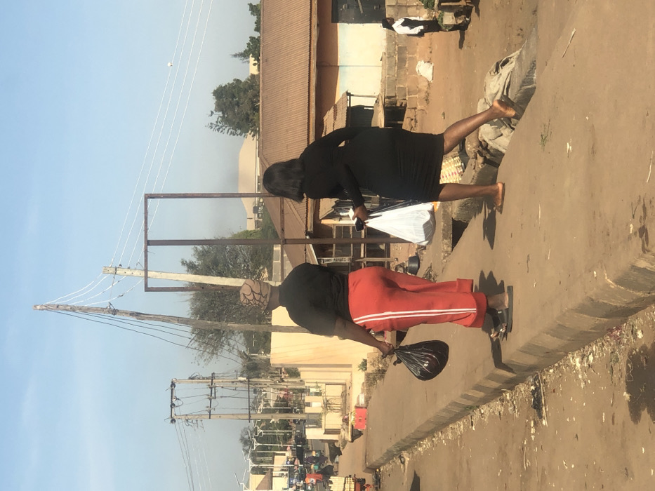 The scene is set in Gura Top, Nigeria, depicting two adult females walking away from the viewer on a raised concrete median or curb under a clear, bright sky