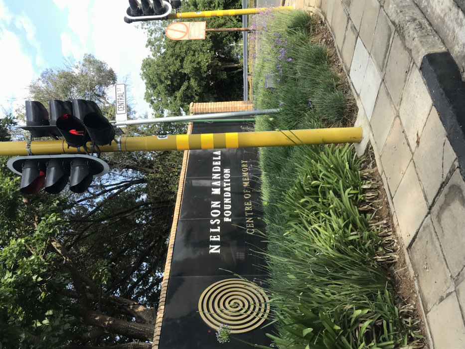 This image captures an outdoor roadside scene at the Nelson Mandela Foundation Centre of Memory, located on Central Street in Rosebank, South Africa