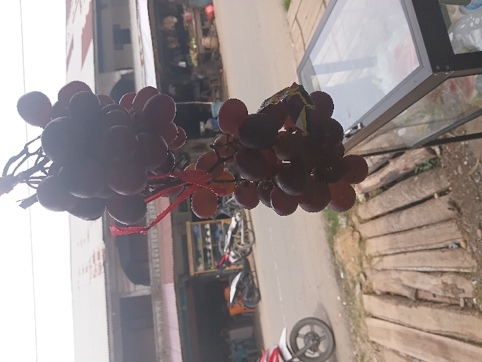 Two bunches of red grapes hang in front of a building and wooden planks. A red string-like object is tied around the left bunch. The background reveals a street scene with a motorcycle, scooter, and other vehicles. A display case is partially visible on the right side of the frame. The image appears to be taken outdoors during the day.