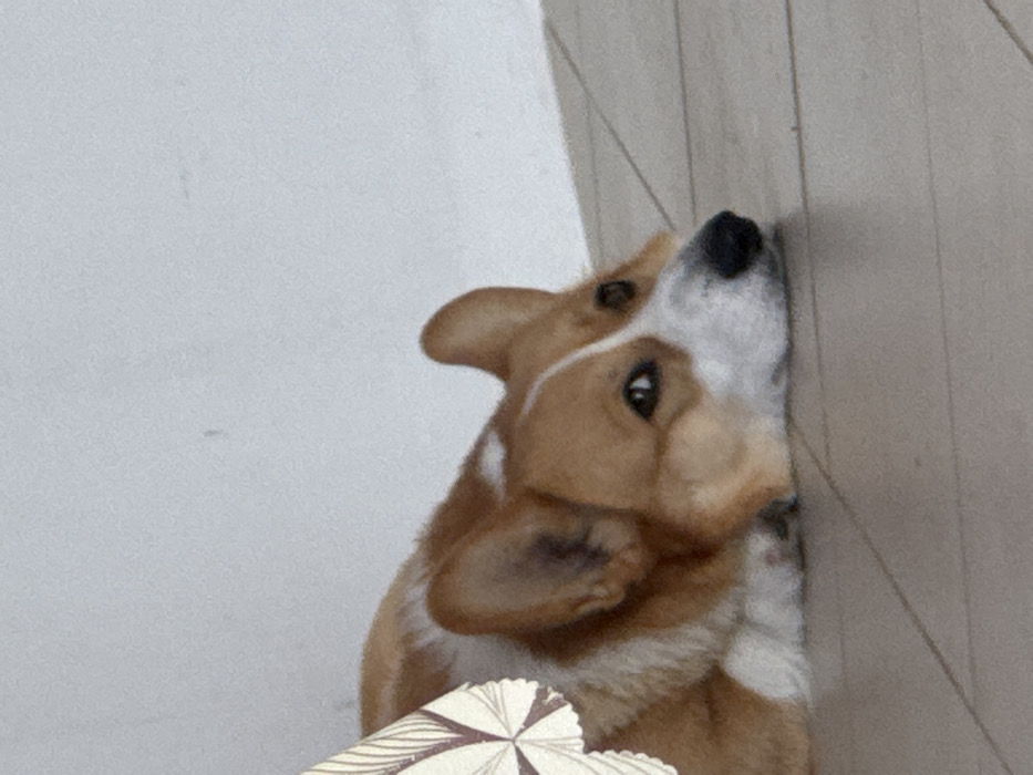 - "A tricolor Pembroke Welsh Corgi dog, predominantly sable and white, is lying prone on a light beige tiled floor, with its head resting on its front paws" by FM-IOQzf1, licensed under CC BY 4.0
