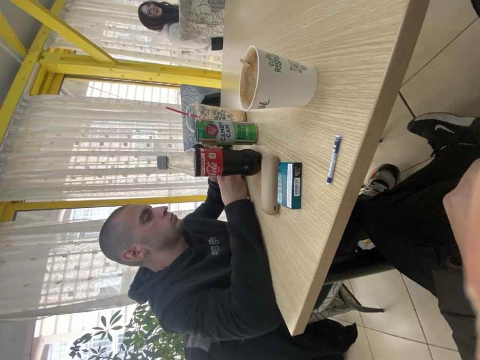 The scene depicts an interior of an establishment, likely a cafe or fast-casual restaurant. The specific location within Plovdiv, Bulgaria, cannot be determined from the visual evidence. In the foreground, a male, appearing to be in his 20s or 30s, with a very short haircut, is seated at a light wood-colored table. He wears a black hooded sweatshirt and is looking downwards, with his left hand resting on the table. Adjacent to his left hand are a beige elongated device, a teal box of "TEREA" brand tobacco sticks, a partially consumed clear plastic bottle of Coca-Cola, and a green can of "CANDY CAN SOUR APPLE" soda. Further on the table, to the right, are a mostly empty clear plastic cup with a red straw, a white paper cup with "CAFE" and "CUP OF RESPECT" branding containing a light brown beverage and a stirrer, and a blue and white pen-like object. The legs of a third individual, wearing black pants and black and white Nike sneakers, are visible in the bottom foreground, indicating their presence at the table. In the background, to the right, a female with dark, long hair is partially visible, seated at another table. She wears a light-colored top and appears to be smiling or laughing, facing away from the primary viewer. The environment features large windows covered by white sheer curtains, accented by bright yellow structural beams or window frames. A green leafy plant is visible on the far left. The floor consists of light-colored square tiles.