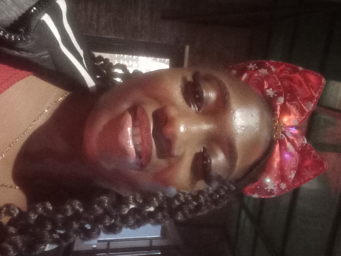 A woman poses with her tongue out. She has curly hair, a red bow in her hair, and wears a gold chain. She is wearing a black and white jacket. The background is dark.