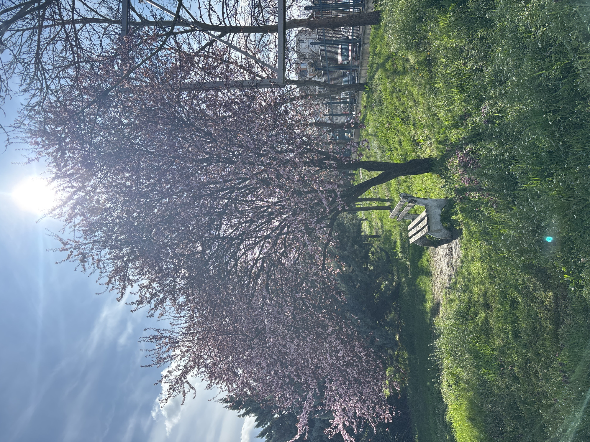The image captures a scene in a park in Shumen, Bulgaria. A large tree, possibly a cherry or plum, is in full bloom with pink blossoms. The sun shines brightly behind the tree. A wooden park bench sits beneath the tree, with greenery surrounding it. Grass covers the ground, and there's a path leading to the bench. In the background, a metal fence and some buildings are visible. The sky is blue with some scattered clouds.