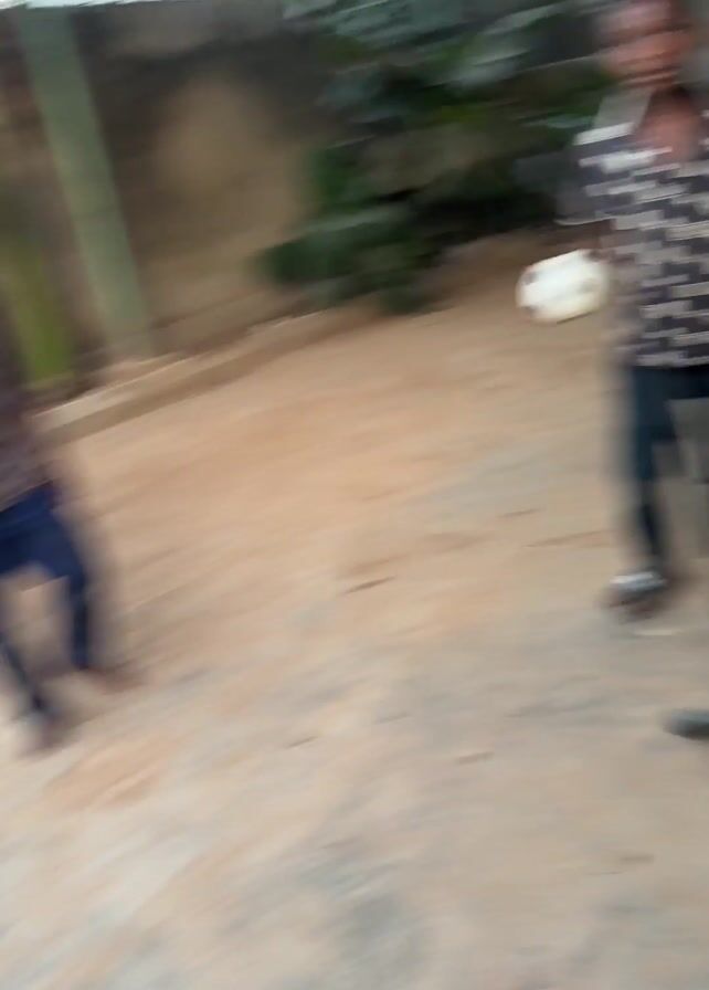 The video depicts a child in a brown shirt and blue pants kicking a soccer ball. A basketball hoop, a soccer goal, and a red ball are nearby. Another young child in blue and white shorts walks in the background. The scene appears to be set in a backyard or courtyard with a concrete surface. The footage is shaky and out of focus.
