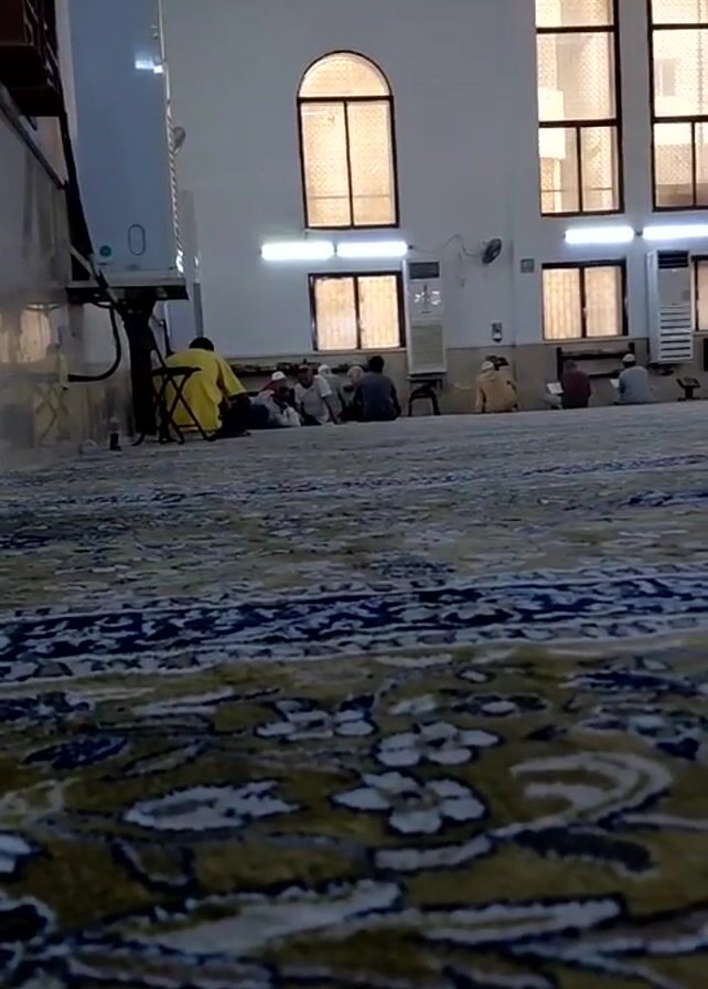 The camera, positioned low, offers a wide view of a mosque's interior. A patterned carpet dominates the foreground, leading to a group of men sitting on the floor, seemingly engaged in prayer or quiet contemplation. They are dressed in various casual attires and traditional Islamic clothing, with a few wearing white skullcaps. The mosque has a high ceiling with arched windows that let in natural light. The walls are painted white, and there are fluorescent lights overhead. A large air conditioning unit is visible to the left. The overall atmosphere is one of peace and serenity.