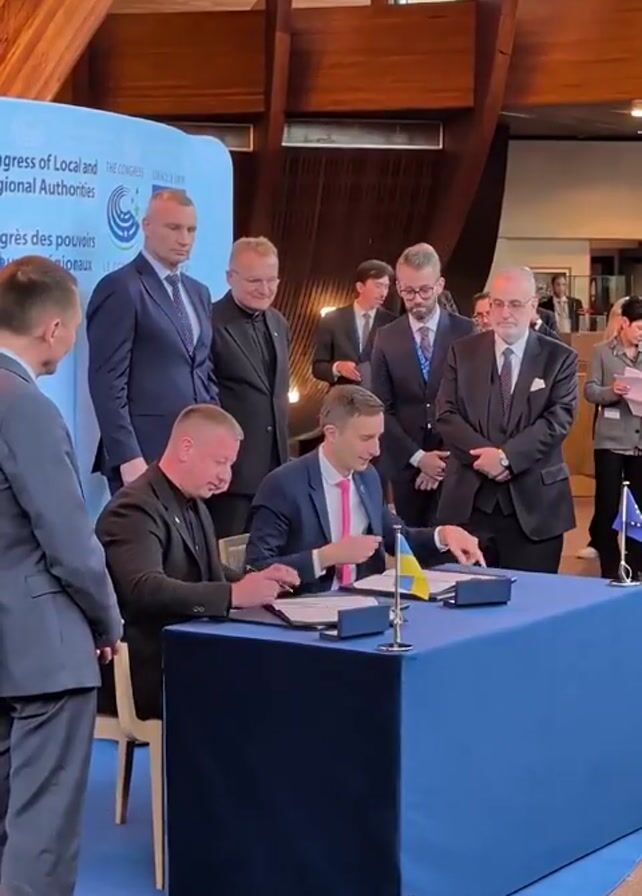 formal event where two men are signing a document at a table covered with a blue cloth. A small Ukrainian flag is placed on the table between them. The man on the right is wearing a blue suit and a pink tie, while the man on the left is dressed in a black jacket over a collared shirt. Several people in suits stand around the table, observing the signing. Behind the table, there is a banner for the "Congress of Local and Regional Authorities." The surrounding environment features a building with wooden architectural elements and large windows. A small speaker is positioned on the floor near the table.