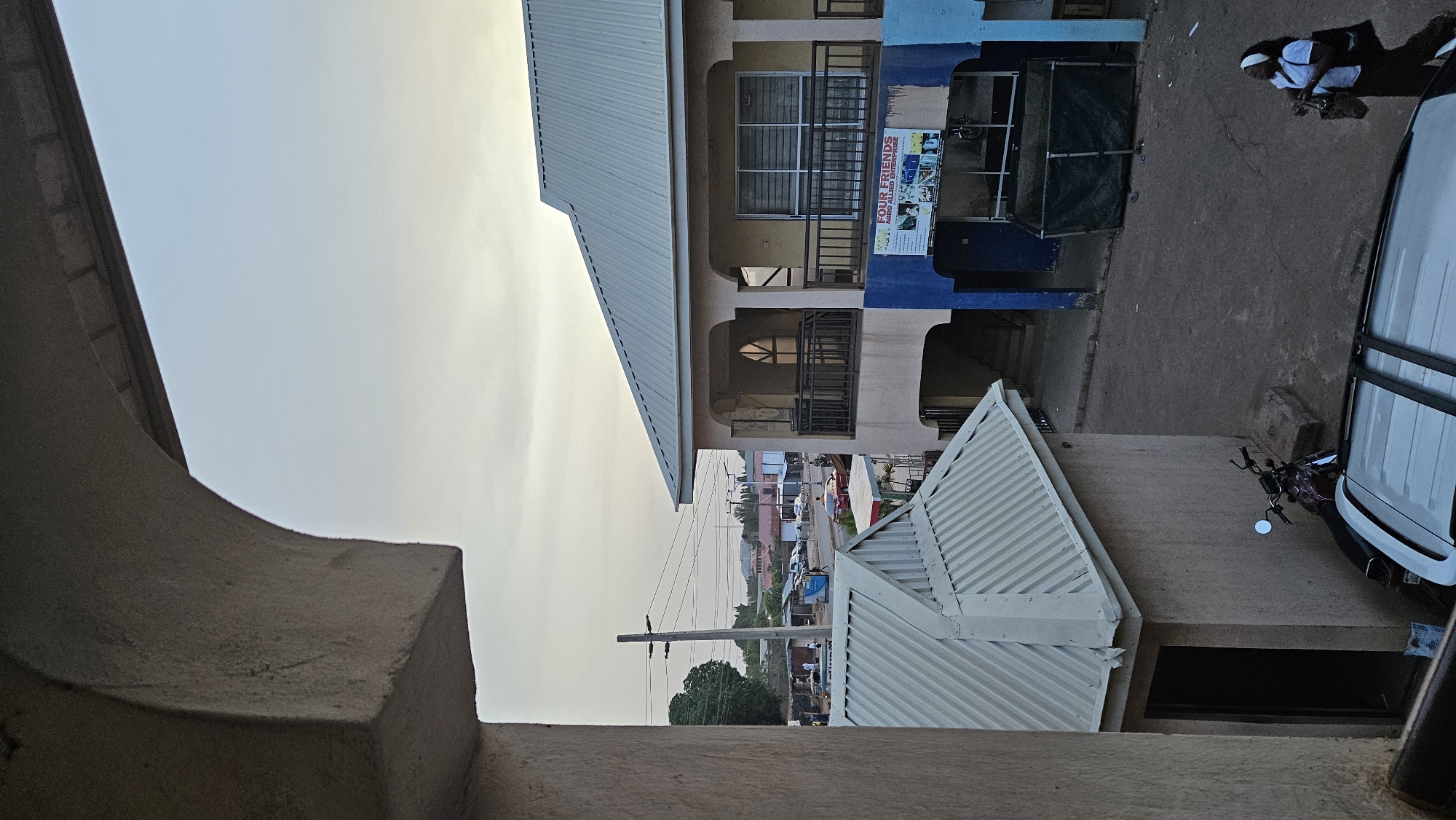 street scene in Sabon Tasha, Nigeria, viewed from an elevated position. A multi-story building dominates the right side of the frame, featuring balconies and a sign that reads "FOUR FRIENDS AGRO ALLIED ENTERPRISES." A white van is parked on the street below, along with a motorcycle. A man wearing a white cap and dark clothing is walking in the same area. Beyond the buildings, a street stretches into the distance, lined with power poles and trees. The sky is overcast. In the foreground, a section of a building or structure provides a partial frame. A corrugated metal roof is visible below the taller building.