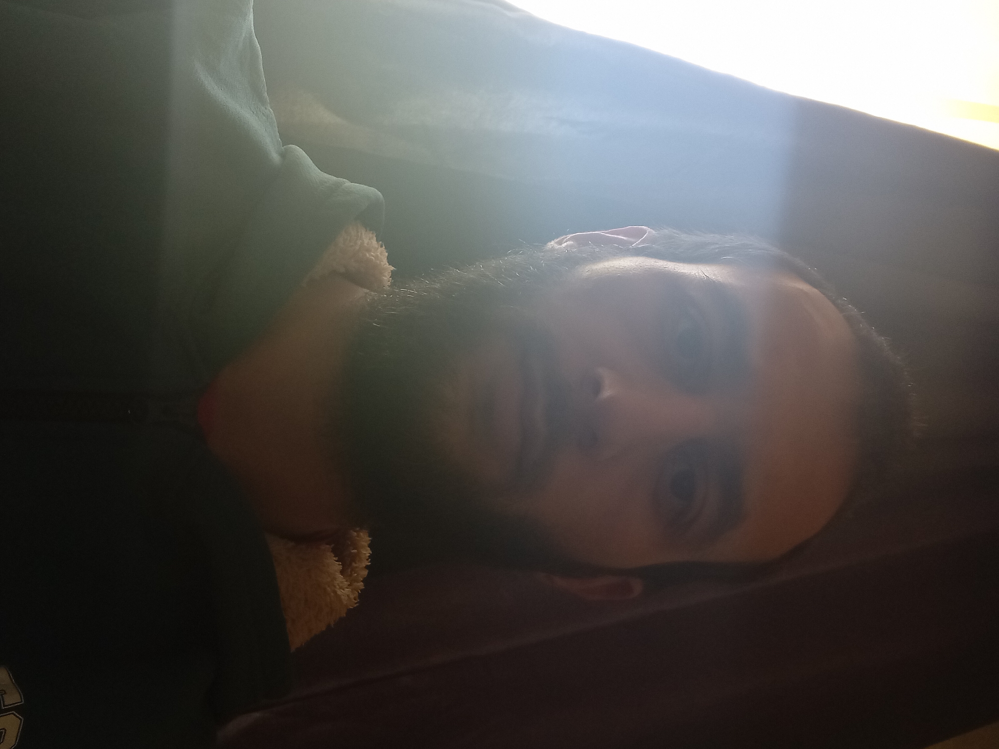 The image features a person with a beard, wearing a dark green hoodie with a fuzzy, beige lining. The individual is lying down against a dark brown surface. Strong light obscures parts of the face, but one eye and the nose are visible. The background is blurry, with a lighter shade above the individual. The image doesn't appear to be taken in Provadia, Bulgaria. There are no specific indicators of location within the image.