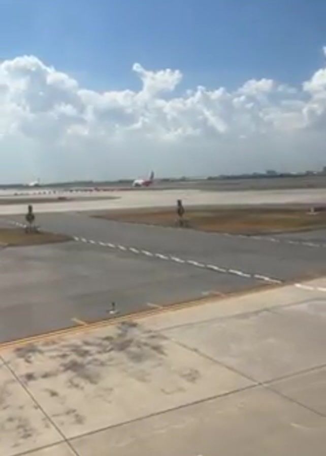 tarmac at an airport on a partly cloudy day. In the distance, an airplane with red accents is visible. There are taxiway markings and regulatory signs on the tarmac. The video is taken from a stationary position behind a window, likely from another airplane or an airport building.