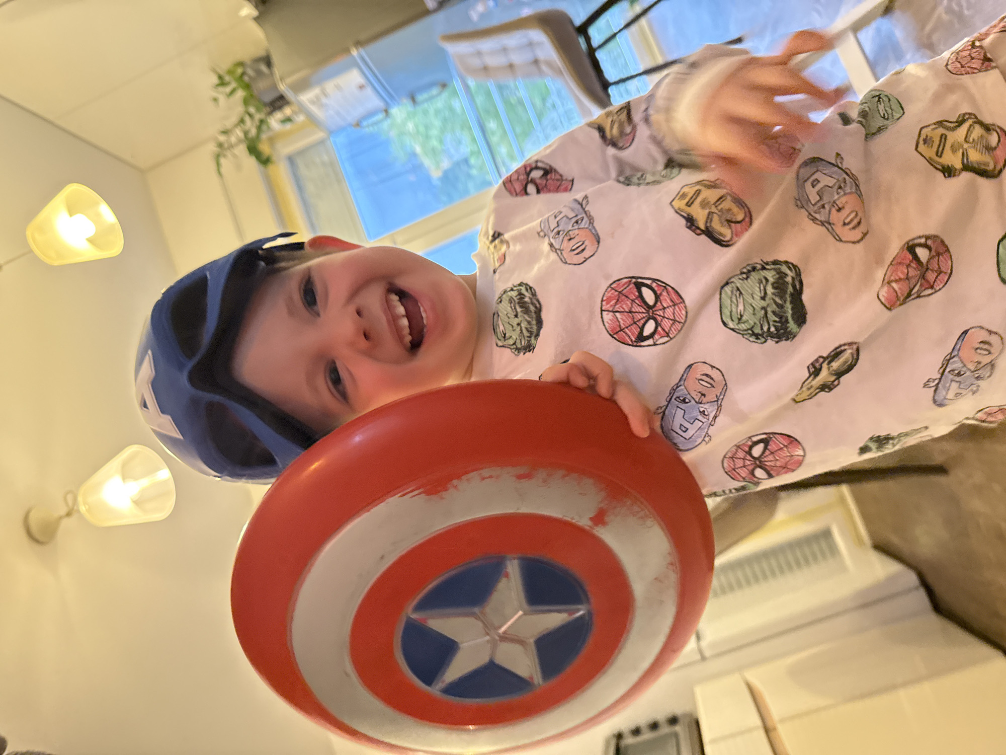 A child wearing a Captain America helmet and pajamas printed with Marvel characters is holding a Captain America shield