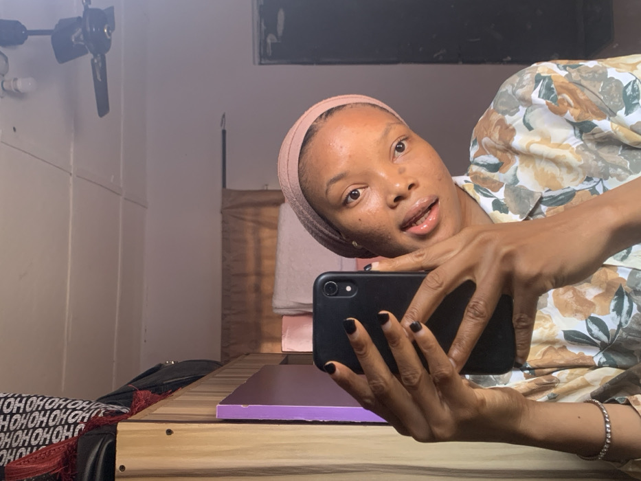 The image depicts an indoor scene in Ilorin, Nigeria. A young adult female, with medium-brown skin, is captured from the chest up, engaged in taking a selfie with a black smartphone, which she holds with both hands. She wears a light beige or pink head covering and a collared, short-sleeved shirt featuring a brown, beige, and green floral pattern. A silver-colored bracelet adorned with clear stones is visible on her left wrist, and her fingernails are painted dark. Her mouth is slightly open, and her gaze is directed towards the phone's camera lens. The background reveals a light-colored ceiling with a visible seam, an exposed light bulb, and a black three-bladed ceiling fan mounted off-center. To the left, a light-wood-toned structure, possibly a shelving unit or bunk bed frame, supports a black bag and another bag with white 'HOHOHO' text printed repeatedly. A purple panel is visible directly below this wooden structure. Light brown curtains hang in the mid-background, partially obscuring a folded white textile item. A dark, reflective surface is present in the far right background of the room.