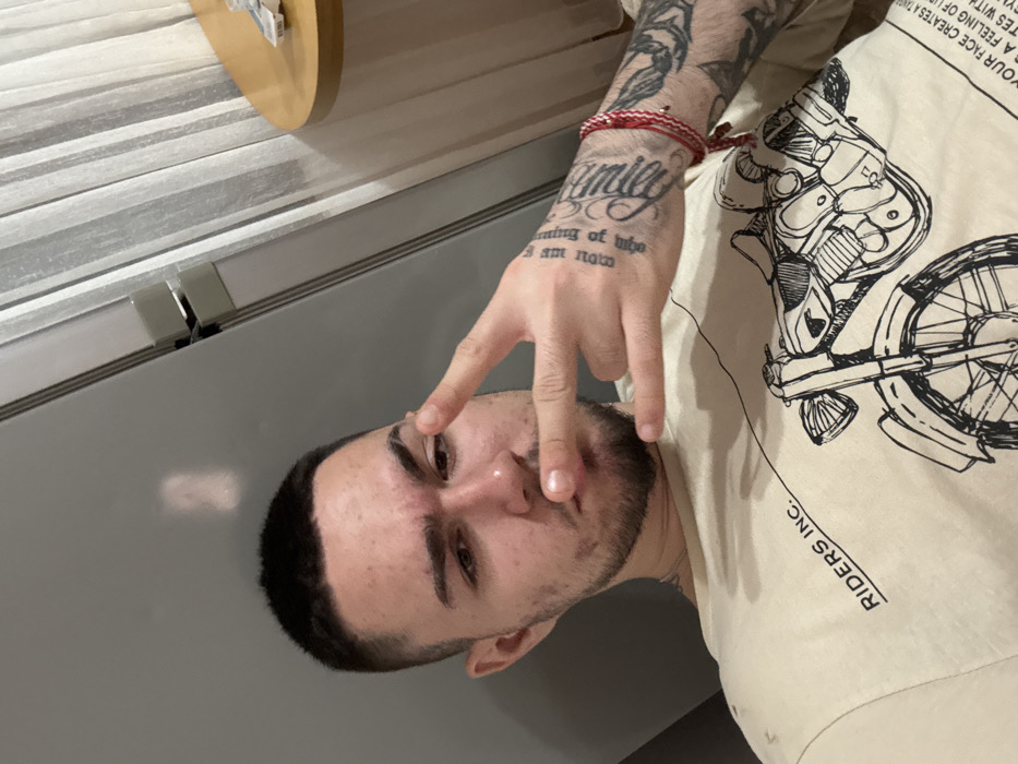 A young adult male, characterized by a short buzz-cut hairstyle and light facial stubble, presents with visible acne on his forehead and cheeks. He is depicted indoors, gazing slightly downward and to his left. He wears a light-colored t-shirt adorned with a black line-art graphic of a motorcycle and the text 'RIDERS INC.' on the chest. His right arm is extensively tattooed, with prominent script including 'Family' on the back of his right hand. Two red and white string bracelets are present on his right wrist. His right hand is raised, forming a gesture with extended index and pinky fingers and bent middle and ring fingers. The immediate background features a smooth, light grey wall or door to the left, and sheer white vertical curtains to the right, adjacent to a light-colored oval wooden table bearing small white objects. The scene is located in the city of Yambol, Bulgaria.