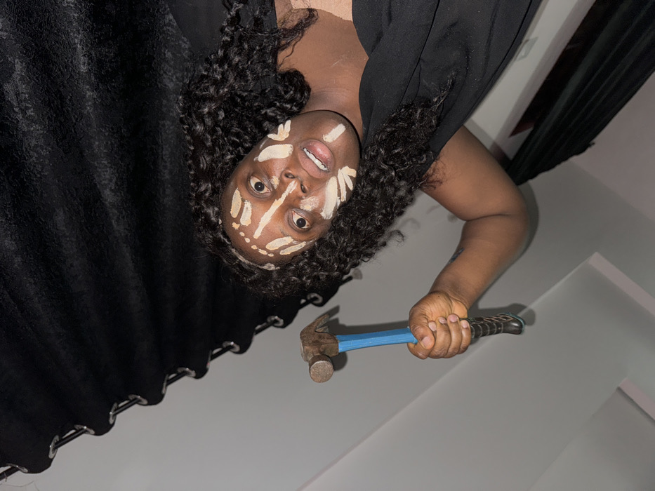 A woman with tan markings on her face and curly hair is holding a hammer in her right hand. She has black clothing draped around her. A black curtain hangs to the left. The background is a plain, light gray wall. The photo is taken from a low angle, making it appear as if she is looming overhead, and it is rotated clockwise.