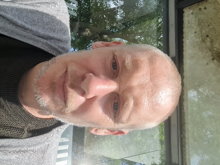 close-up portrait of a man with a shaved head and a white beard. He is wearing a grey sweater over a black shirt and has a neutral expression on his face. His face is illuminated by natural light. The background is out of focus, but a window with a view of trees can be seen behind him. This image was taken in Saint-Étienne, France, at the coordinates (latitude: 45.416, longitude: 4.393).