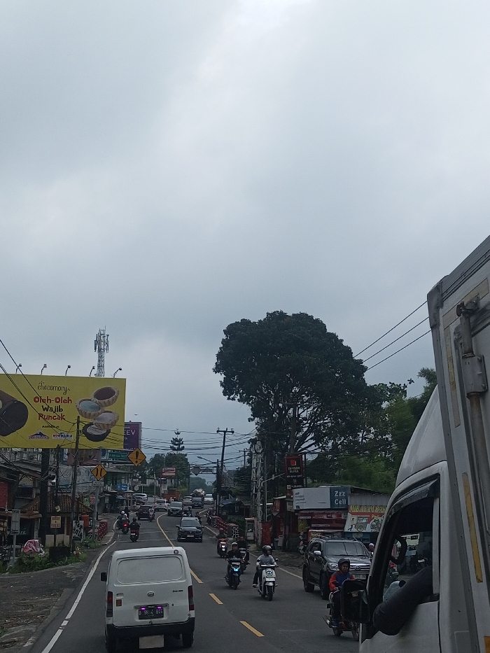 A road in Indonesia, perhaps near Puncak, is filled with cars and motorcycles on a cloudy day. A white van is visible on the right. A large billboard and cell tower rise up on the left. Shops line the road. A tall tree stands near the road. The sky is overcast.