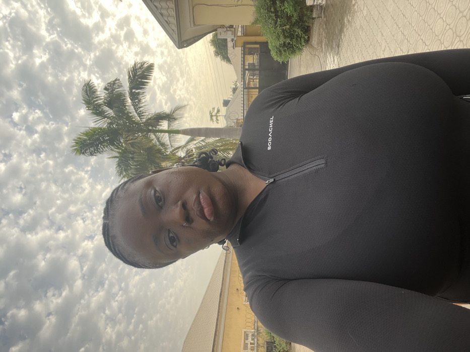 An individual, likely female, is positioned in the foreground, partially obscuring the view. She wears a fitted, dark-colored long-sleeved top with a small zipper detail near the collar and the word "BODACHEL" visible. Her hair is styled in cornrows with curly ends. In the background, a palm tree and a building with a light-colored exterior are visible against a sky filled with textured clouds. The image appears to be taken outdoors, possibly during the day.