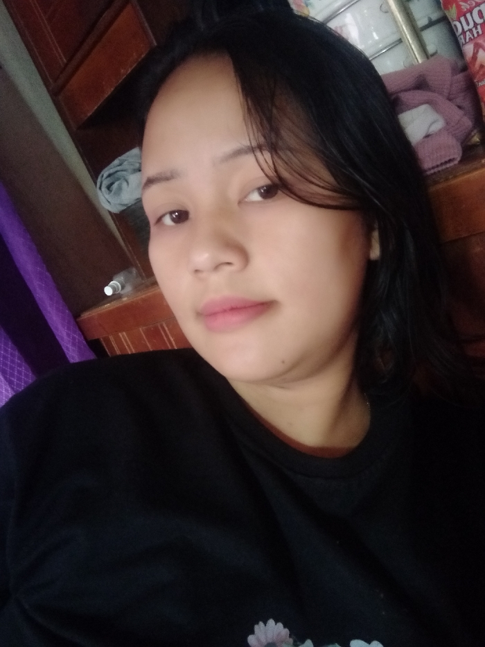 A selfie of a young woman with dark hair and light skin. She wears a black top with a floral design on the bottom. Her expression is neutral, and her lips are light pink. The background shows a wooden cabinet or shelving unit, with a purple curtain to the left. An object wrapped in light grey fabric is visible above the cabinet.
