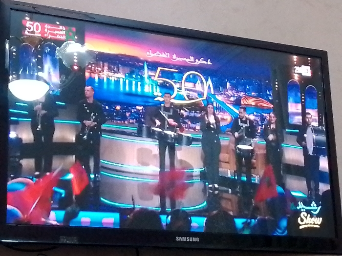 A Samsung TV screen displays a televised musical performance. A band of seven members stands on a stage with a cityscape backdrop. They are playing various instruments like drums and trumpets. The number "50" is prominently featured above the performers. Below the stage, waving red flags suggest a celebratory or patriotic event. The show's logo, partially obscured, can be seen in the lower right corner.