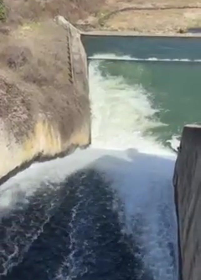 The camera looks down from a dam structure. Water pours over the edge, creating white froth as it lands in the lower water. The water is light green in the area behind the dam. The scene beyond the dam shows a river that splits into two streams with a grassy area in between. A town is visible in the distance. The sky is light blue. The dam is made of concrete. There are sparse plants growing on the side of the dam. A small ladder is on the left side of the dam.