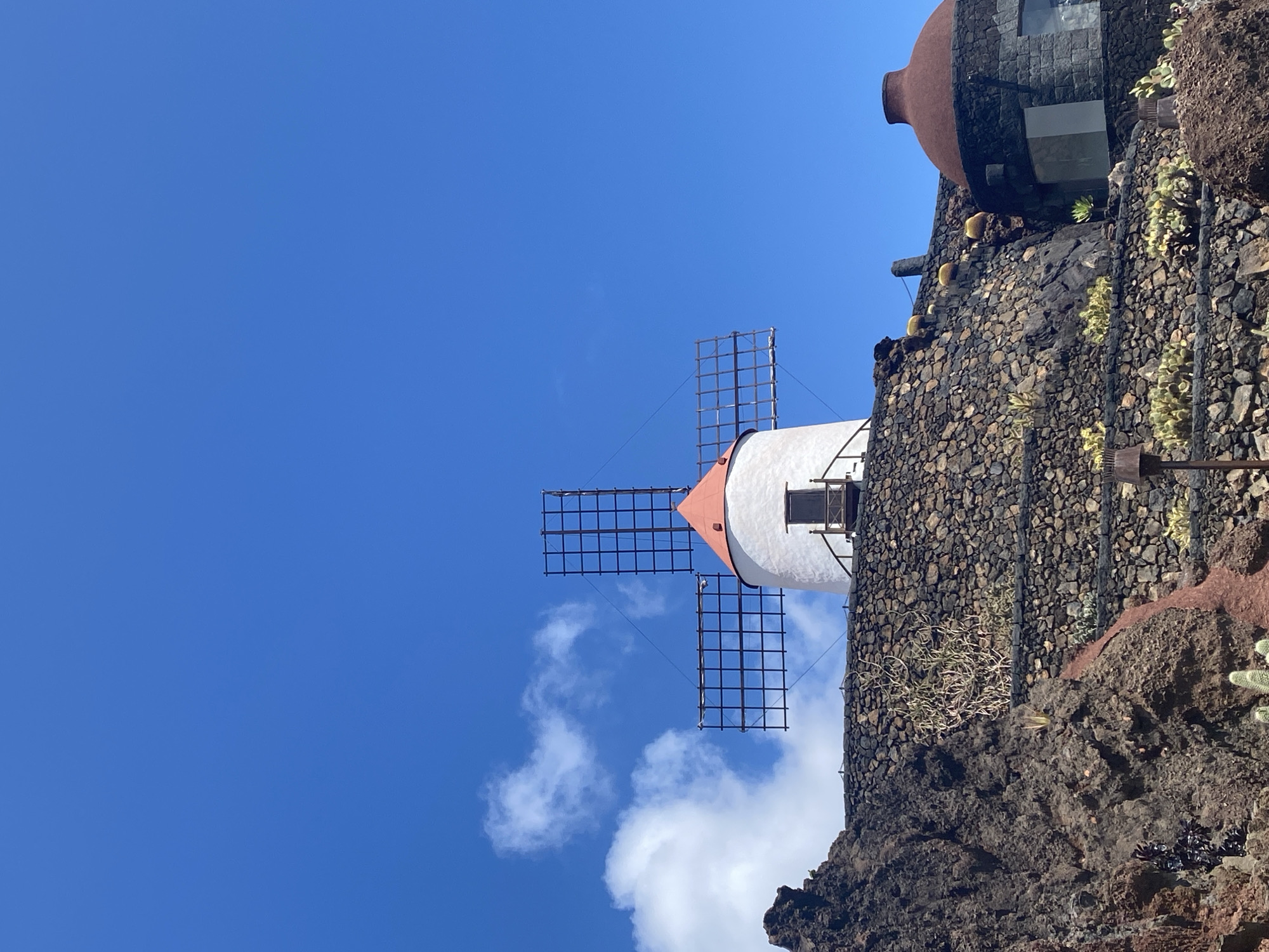The image depicts a windmill atop a structure built into a dark, rocky landscape, likely volcanic. The windmill is white with a red roof, and its sails are stationary and appear to be made of dark metal framework. The structure supporting the windmill is constructed of dark, uneven stones. In the upper right corner of the image is another structure, also built of dark stones, topped with a large, round, red-brown object, resembling a pot or vessel. There are plants growing on the structure in pots. The sky is bright blue with a few white clouds. Based on the location and architecture, this is likely the “Casa Museo del Campesino” windmill located in Teguise, Spain.