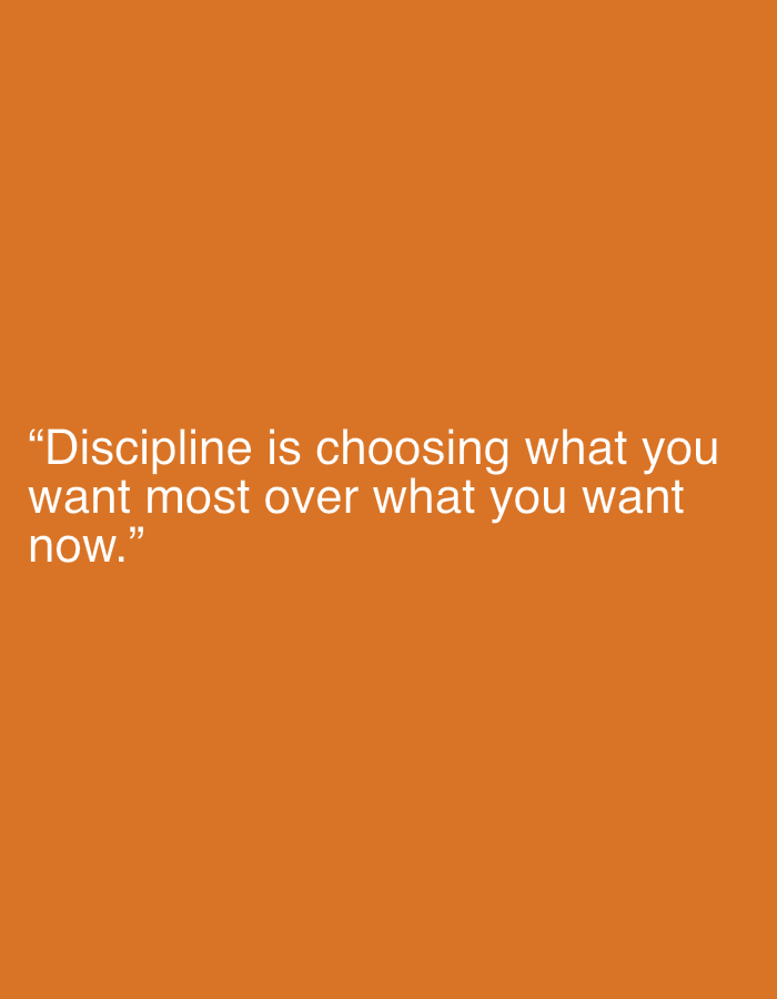 The image displays white sans-serif text set against a solid, untextured orange background. The text, positioned in the lower half of the frame and horizontally centered, reads: "Discipline is choosing what you want most over what you want now." This scene is located in the city of Sofia, Bulgaria. No people, discernible physical subjects, objects beyond the text, actions, interactions, or complex environmental details are present; the visible environment is a uniform orange field.