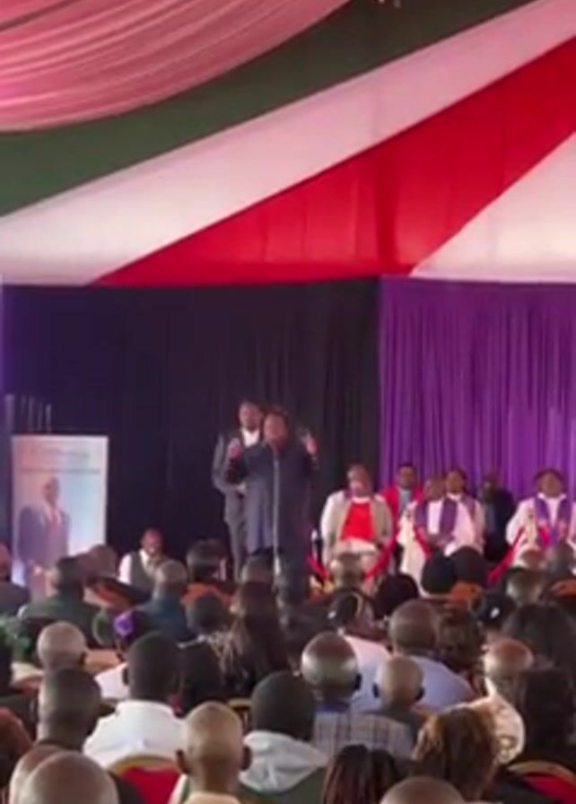 man addressing a large audience from a podium under a tent decorated with red, white, and green fabric. Behind him, seated on a platform, are several people in religious vestments. A banner to the left of the speaker features a portrait of another man. The audience, mostly composed of African individuals, is listening attentively. The setting appears to be a formal gathering, possibly a religious or community event.