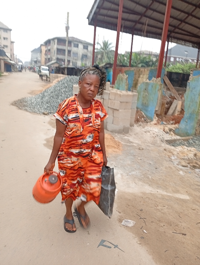 This image depicts an adult female positioned centrally on an unpaved road in Aba, Nigeria, under overcast daylight conditions. The individual, who appears to be middle-aged with dark skin, wears a short-sleeved, knee-length dress featuring an orange and white tropical pattern. Her hair is braided and styled upwards. In her left hand, she carries an orange, portable gas cylinder, and in her right hand, she holds a dark-colored, possibly plastic, shopping bag. She wears dark grey flip-flops and looks directly towards the viewer with a neutral expression. The immediate foreground consists of a dirt road with minor scattered debris. A dark, angular shadow is cast on the ground to the right of the subject. To the left of the subject and receding into the background is an unpaved street lined with multi-story concrete buildings, some appearing partially unfinished or weathered. A large pile of grey construction aggregate (gravel) is situated beside the road. Further down the street, blurred figures and a white van are discernible. A tall, slender pole-like structure, possibly a telecommunication mast, is visible in the distant background. To the right of the subject, a construction area is visible. This includes an open-sided structure with a corrugated metal roof supported by reddish-brown metal beams. Stacks of light grey concrete blocks are present, alongside fragments of light blue-painted walls and general construction rubble, indicative of ongoing work or demolition. Sparse vegetation, including a palm tree, can be seen beyond the construction elements.