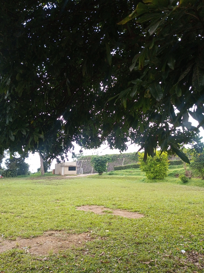 A lush green field stretches toward a low stone wall with greenery. A small, rectangular building sits to the left, partially obscured by a large tree. The tree's dense canopy, filled with leaves, dominates the upper portion of the image, casting a shadow over the foreground. The scene appears peaceful, bathed in soft light. The ground is slightly uneven, showing hints of soil beneath the grass.