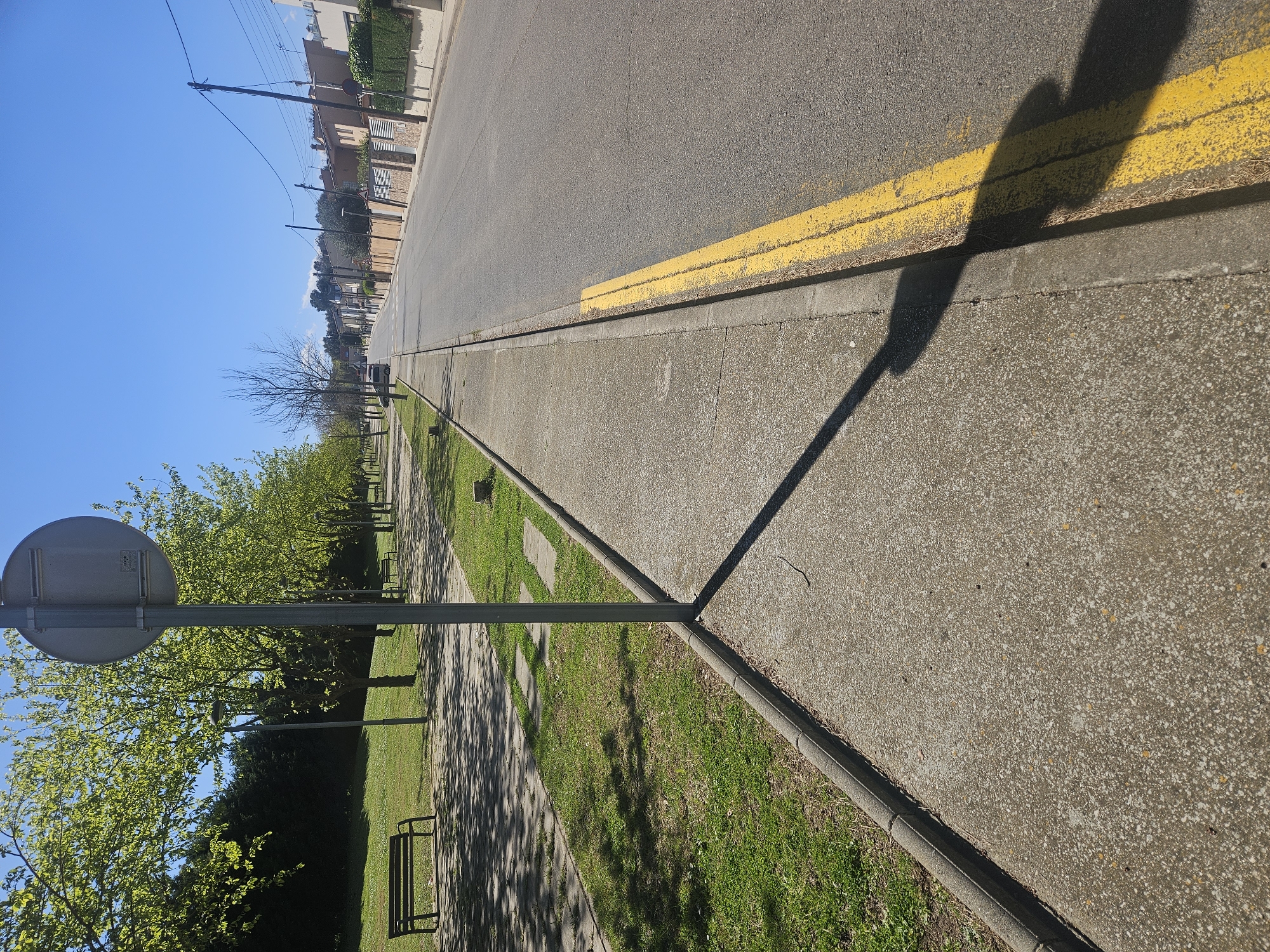 The scene depicts a residential street in Mas Aliu, Spain, under a clear, bright blue sky. In the foreground, a concrete sidewalk occupies the left, separated by a low grey curb from an asphalt road on the right. A grey cylindrical pole, approximately 0.15 meters in diameter, stands on the sidewalk near the center, casting a long, distinct shadow diagonally across the sidewalk and partially onto the road. A double solid yellow line is painted along the edge of the asphalt road next to the curb. To the left of the sidewalk, a public park area features a well-maintained grassy lawn and a paved pedestrian path. Several trees with vibrant green foliage line this path, interspersed with a few deciduous trees exhibiting bare branches. Multiple dark-colored park benches are visible along the path. A dense line of dark green evergreen trees forms the rear boundary of the park. The asphalt road extends into the distance, appearing clear of active vehicles, with a single light-colored hatchback parked on the left shoulder further down the street. Along the right side of the road, a continuous row of residential houses with varied architecture, pastel-colored facades, and tiled roofs is present. These properties feature fences, low walls, and manicured hedges. Several dark wooden utility poles with overhead power lines run parallel to the road along this side. No people are visible in the image.