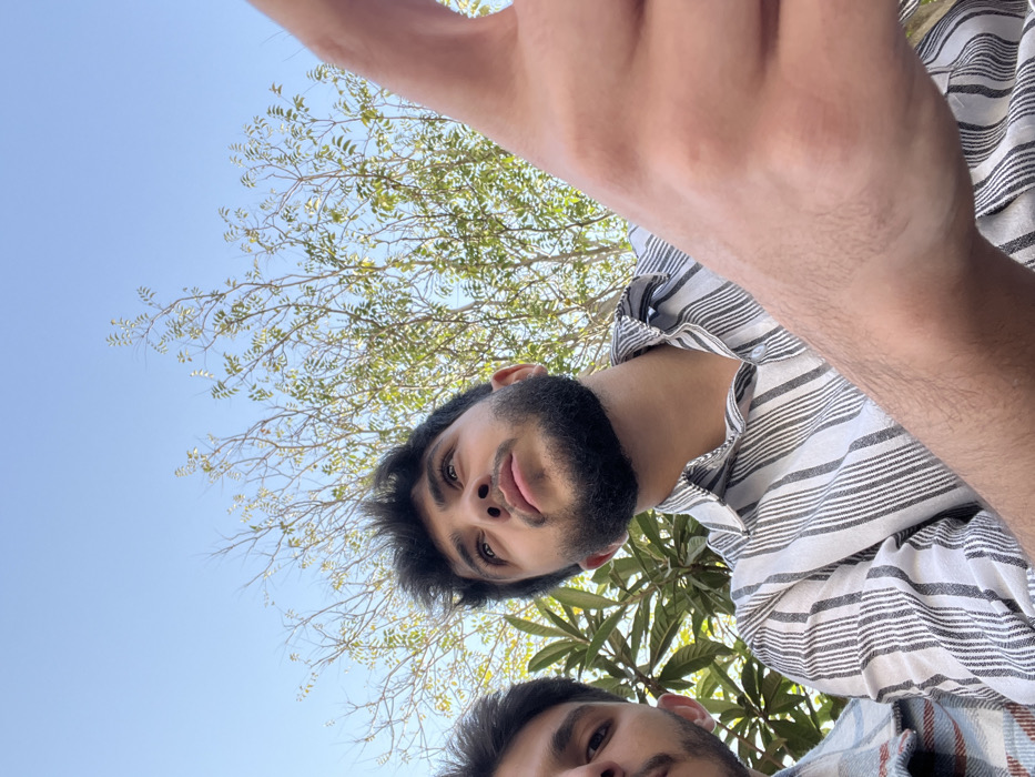 An upward-angled outdoor photograph depicts two individuals and a hand under a clear blue sky in Al-Qanawat Municipality, Syria. In the foreground, from the lower-right, a human right hand with its palm facing upwards/towards the viewer extends into the frame. To the left of the hand and centrally positioned, a male subject with dark hair and a beard, wearing a white and black vertically striped button-up shirt, looks upward and slightly to the right. A second male subject is partially visible on the far left, showing only the left side of his face and a portion of a light blue and orange plaid shirt. His gaze is directed downwards or towards the camera. The background consists of a bright, clear blue sky and various trees with green foliage and visible branches, illuminated by natural daylight.