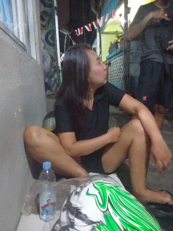 A female with dark hair and a light to medium complexion is seated on the ground in a low-light urban environment in the city of Unknown, Unknown